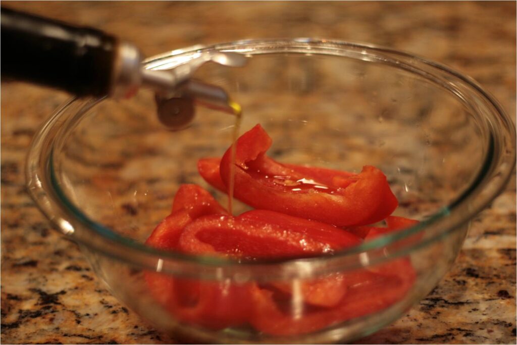 Toss strips of red bell pepper with 1 tablespoon EVOO in a medium sized bowl.  Add strips of red bell pepper to baking sheet for grilling.  Set the EVOO coated bowl aside for dressing the arugula.