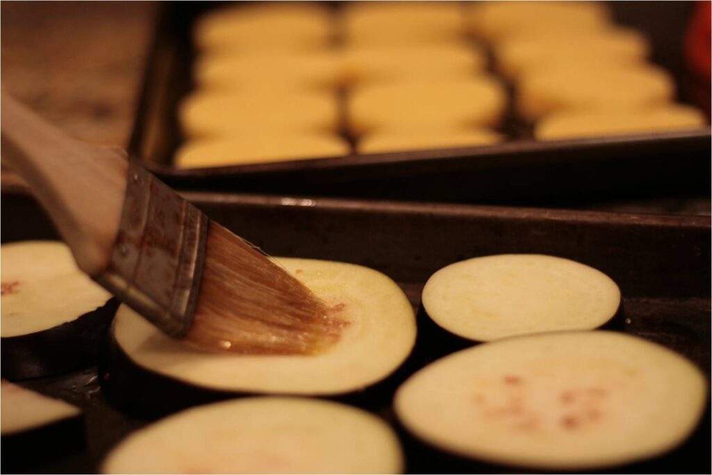 Brush about 3 tablespoons of EVOO on the top sides of the polenta and eggplant slices.