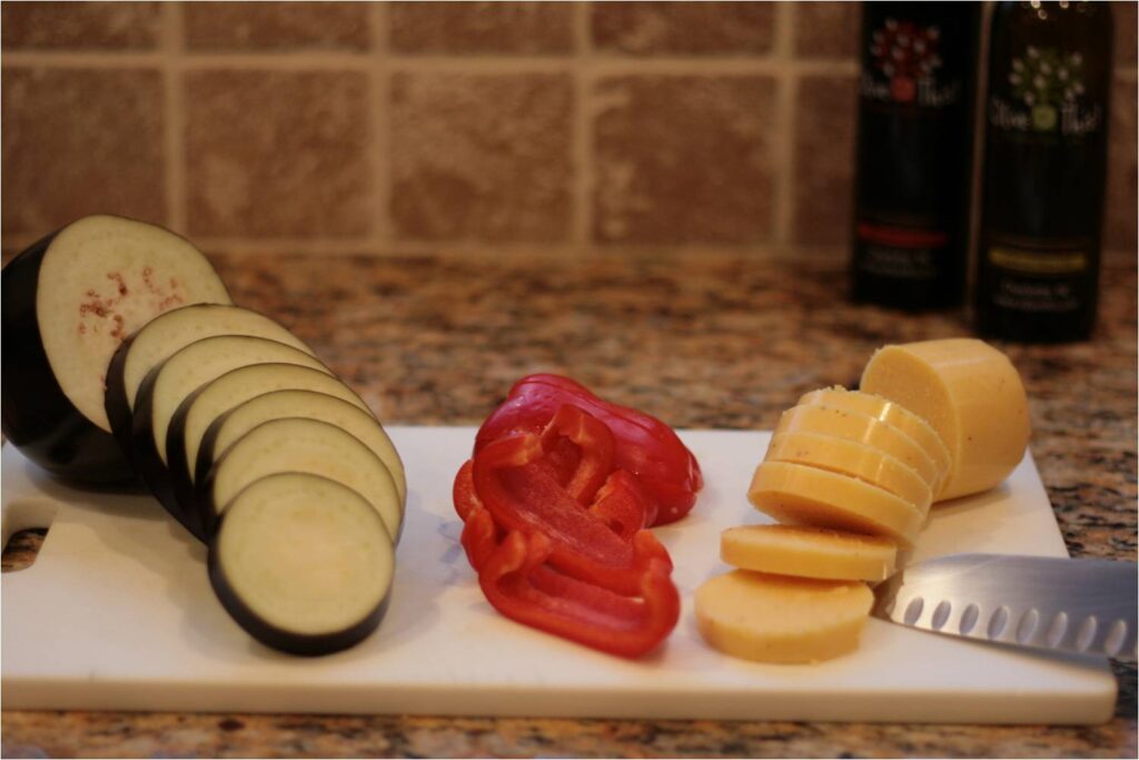 Cut eggplant into ½ inch slices. If you have large-sized discs of eggplant, cut the disc in half, forming two half circles.  Remove the seeds and ribs of the red bell pepper and cut into eight strips.  Carefully slice polenta about ½ inch wide producing at least 12 discs.  For the polenta, use a knife with a narrow blade or the wire of a cheese board cutter works perfectly.