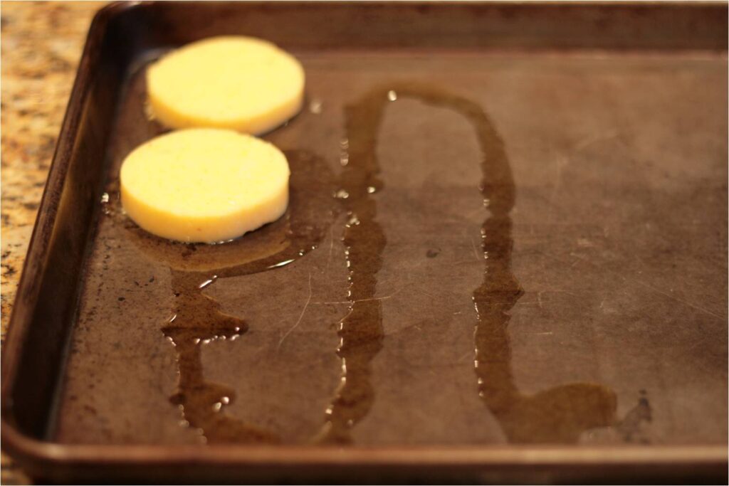 To prepare the ingredients for grilling, drizzle approximately 2 tablespoons of EVOO in a zig-zag stream onto a rimmed baking sheet. Place polenta on the stream of oil and smear to coat the bottom of the polenta. Repeat the same process for the eggplant slices.