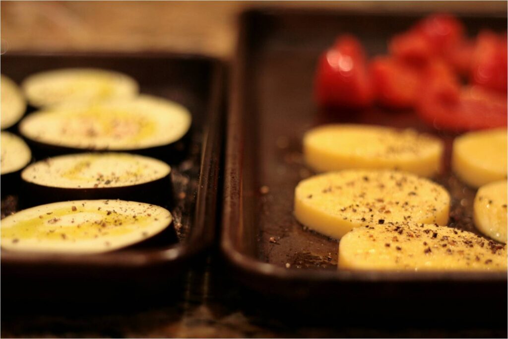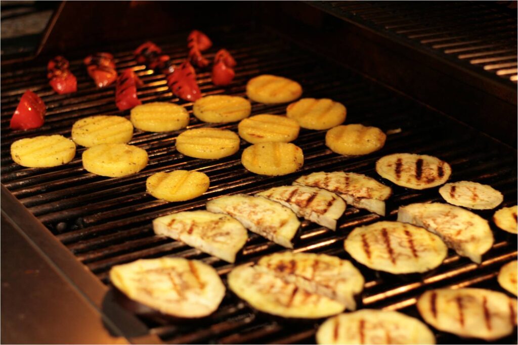 Generously salt and pepper the grilling ingredients (polenta, eggplant and red bell peppers).