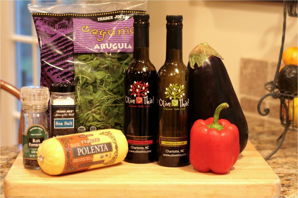 Here’s a delicious vegetarian entrée where all the cooking is done on the grill. This is another great use for the Wild Mushroom and Sage Olive Oil that you may still have left from the Apple and Sausage Stuffing recipe we posted for Thanksgiving. The texture of the grilled polenta goes well with the other ingredients and the drizzle of Traditional balsamic at the end finishes the dish beautifully. The measurements of extra virgin olive oil and balsamic in this recipe are just a guideline; indulge to your liking! You can grill your ingredients ahead of time and keep them warm in the oven; when it’s time to serve, toss your arugula and assemble.