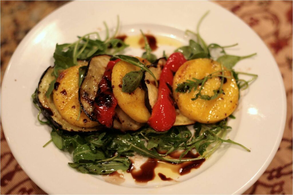 To plate, split the dressed arugula evenly onto four serving dishes.  For each serving, layer ingredients alternating about 3 discs of polenta, approximately 3-4 slices of eggplant and 2 strips of red pepper.  Generously drizzle about ½ teaspoon of balsamic vinegar (or more to taste) over each serving.  Salt and pepper to taste and serve immediately.