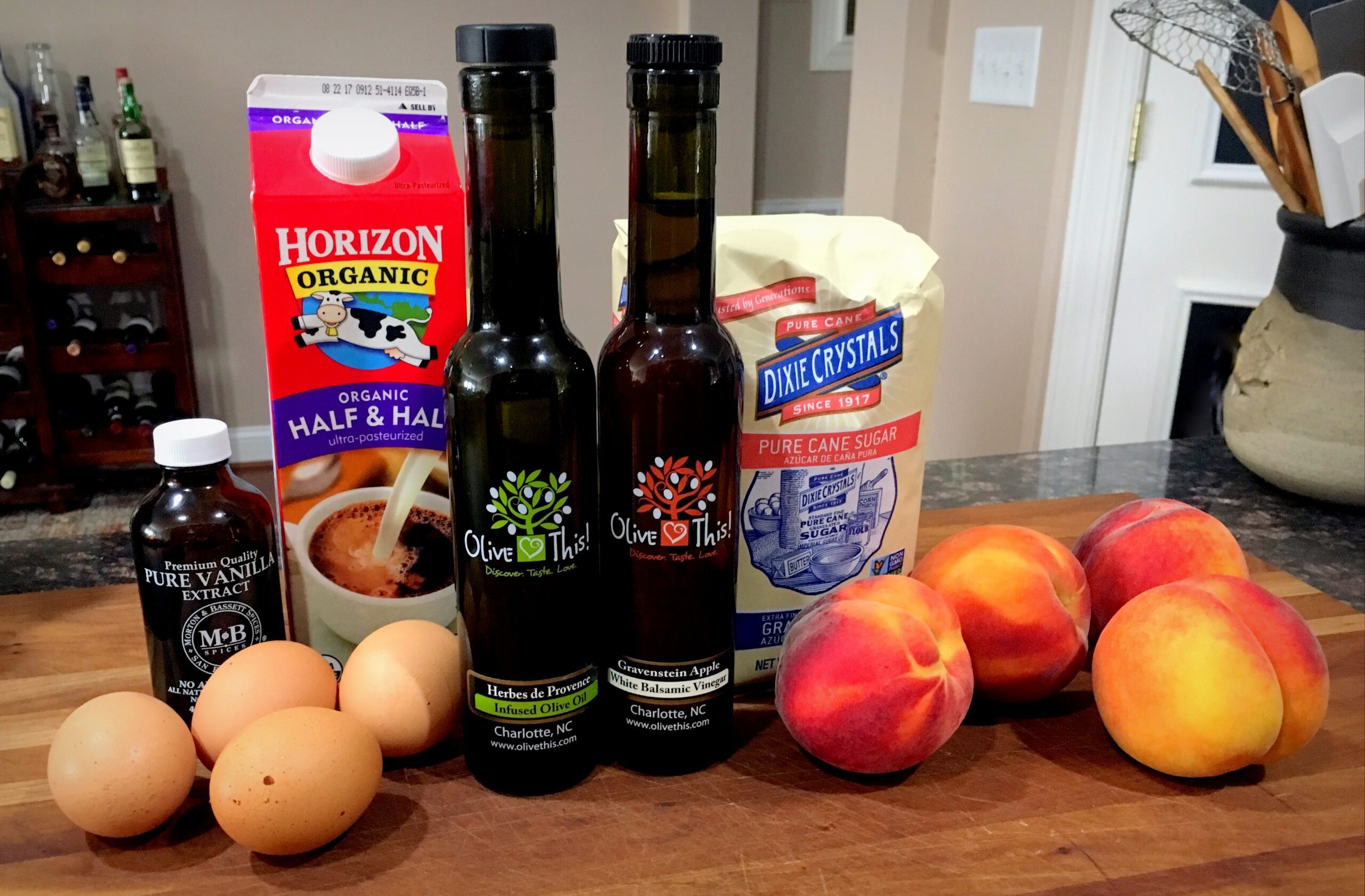 We are pairing the sweet poached peaches with a savory homemade olive oil ice cream to balance the flavors and provide an unexpected twist. Olive oil and ice cream? You bet! This recipe results in a delicious creamy ice cream which is simple to make with an ice cream maker or without. You can use any favorite oil; the fruit fused olive oils such as Blood Orange or Persian Lime work especially well. We particularly love the twist of a savory oil with the creamy sweet ice cream.