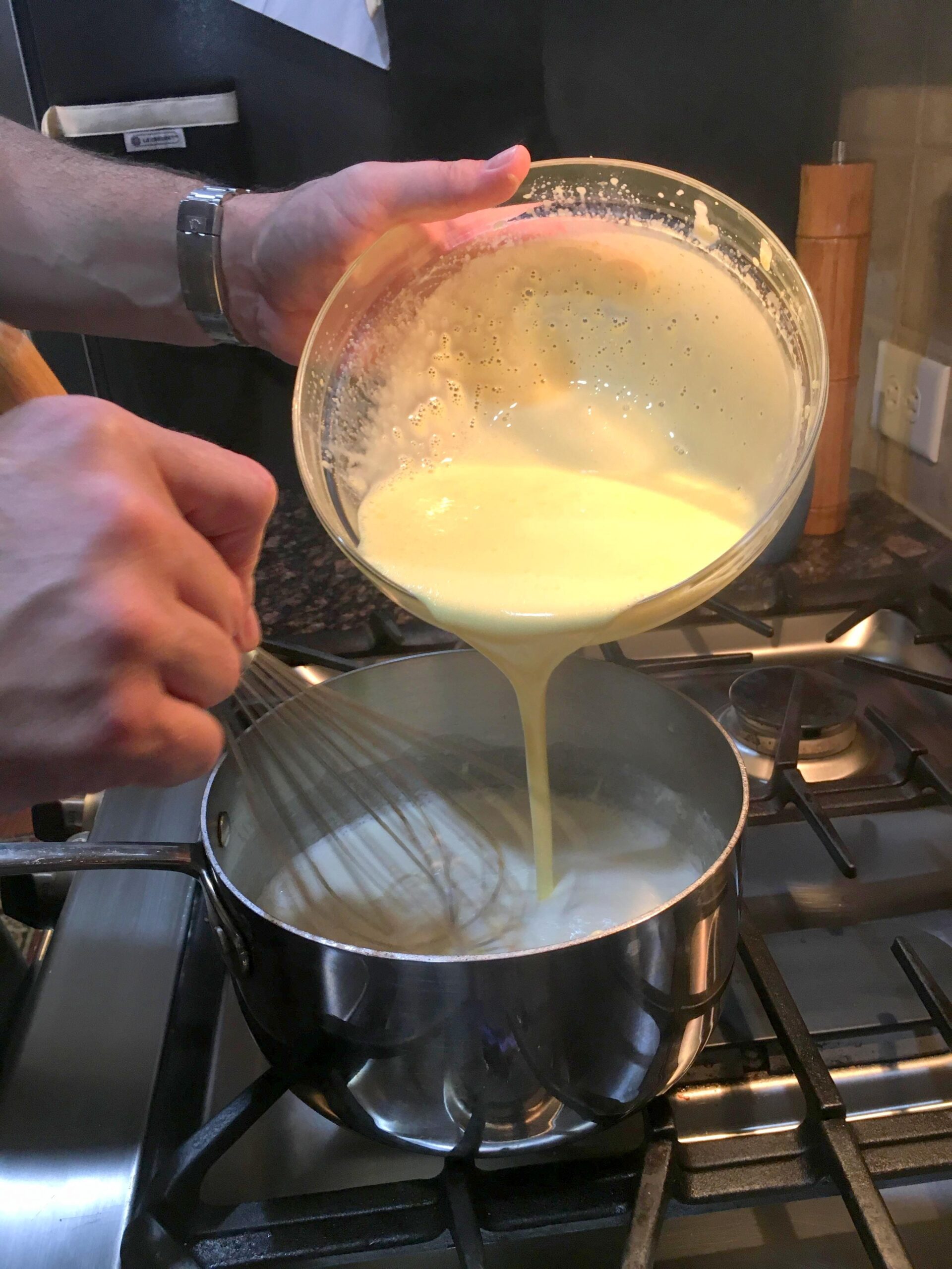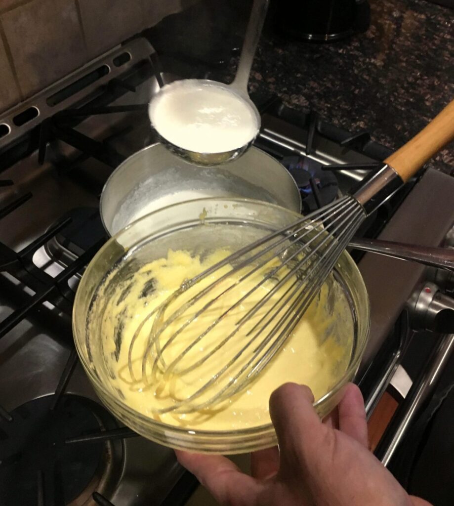 Remove the saucepan from the heat. Whisking constantly, add 1/2 cup of the hot half-and-half mixture to the egg yolk mixture. This is called tempering the egg (yolks) and helps prevent the egg mixture from curdling due to the hot liquid.