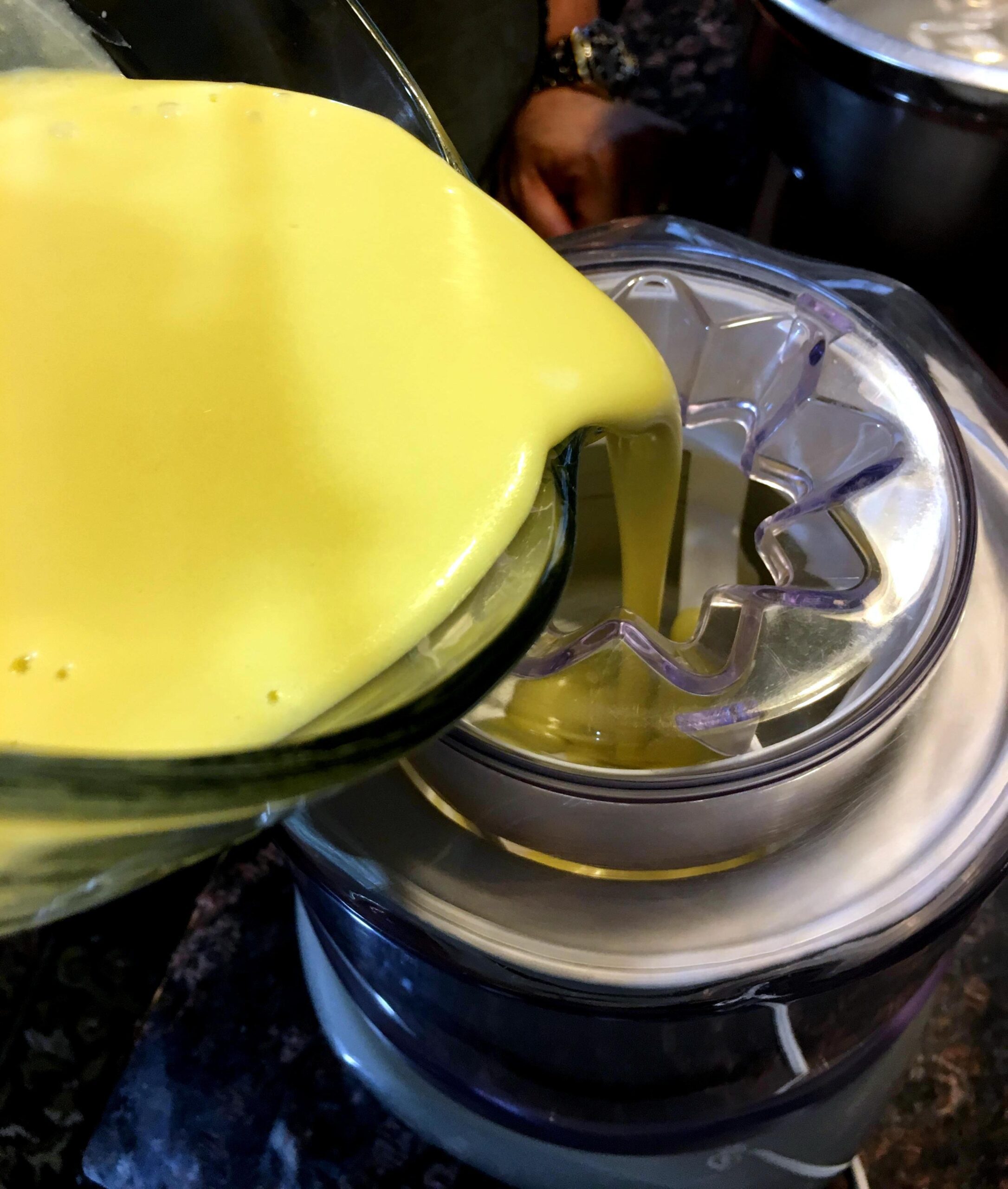 Whisk in the olive oil and vanilla. Pour the custard into the ice cream maker until it starts to firm up to desired consistence. Then place it the freezer for a few hours to freeze up.