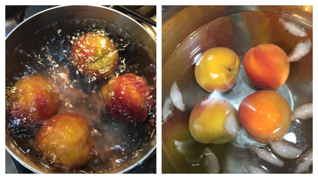 While the ice cream is freezing prepare the peaches. To peel the peaches first submerge them in a pot of boiling water for 1 – 2 minutes. Then plunge them into an ice bath. This should make the skins easier to peel off. If it is still difficult to peel by hand, use a vegetable peeler.