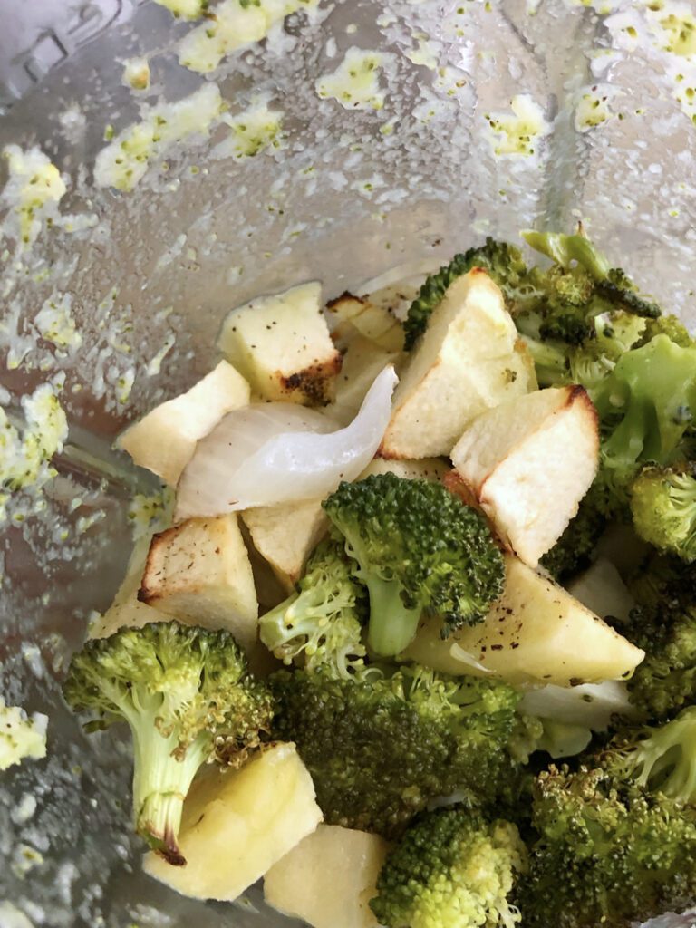 Preheat oven to 400° F. Toss the cut apples, onion, and broccoli with the olive oil, 2 teaspoons kosher salt and ½ teaspoon black pepper. Spread out evenly on a baking sheet lined with parchment and bake until soft, about 25-30 minutes. Remove, let cool for about 30 minutes.