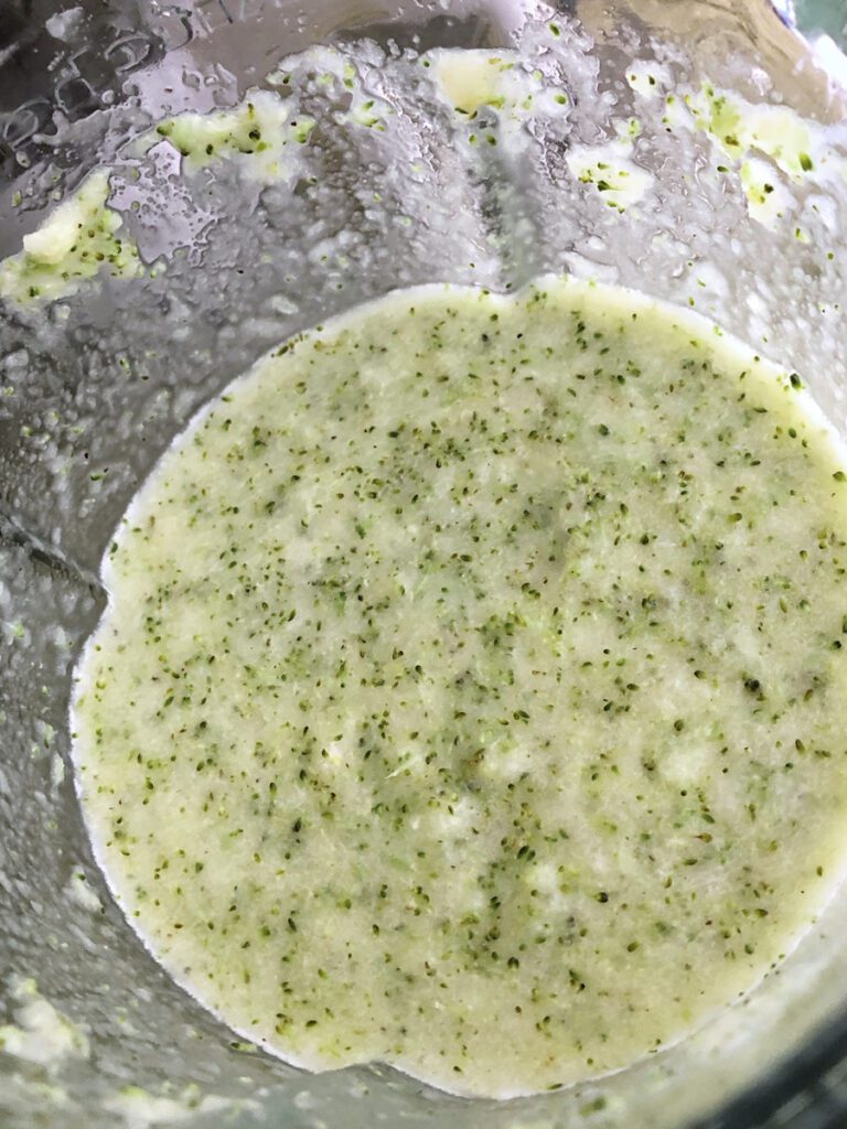 Working in 2 batches take half of the cooled apple broccoli mixture and place in a blender. Add 1 ½ cups of the Chicken Stock. Blend on mix until all incorporated.