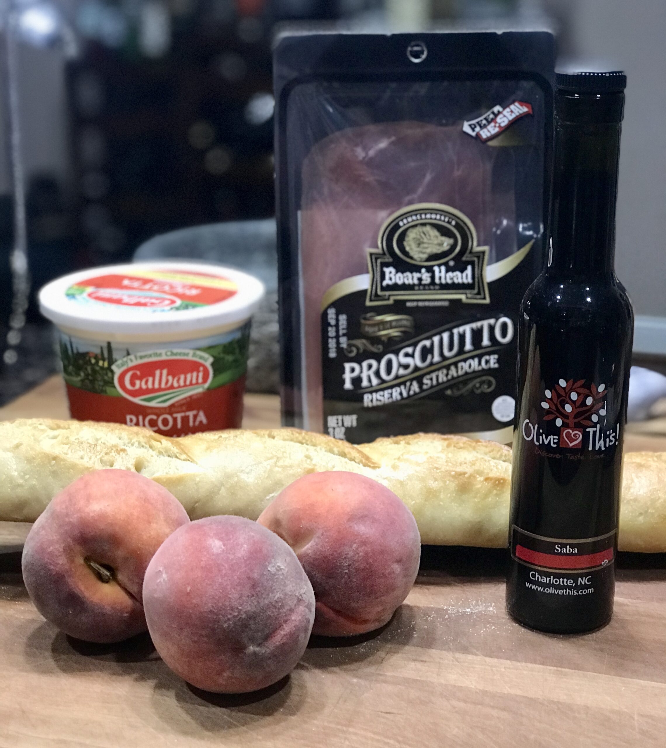 Slice and toast the baguette on a cookie sheet in the oven at 350 degrees. While they are toasting in the oven slice the peaches and wrap them with prosciutto. When the bread is toasted remove from the oven and spread each slice with ricotta cheese. Top it with the wrapped peaches. Drizzle with Denissimo or Neapolitan Balsamic Vinegar.