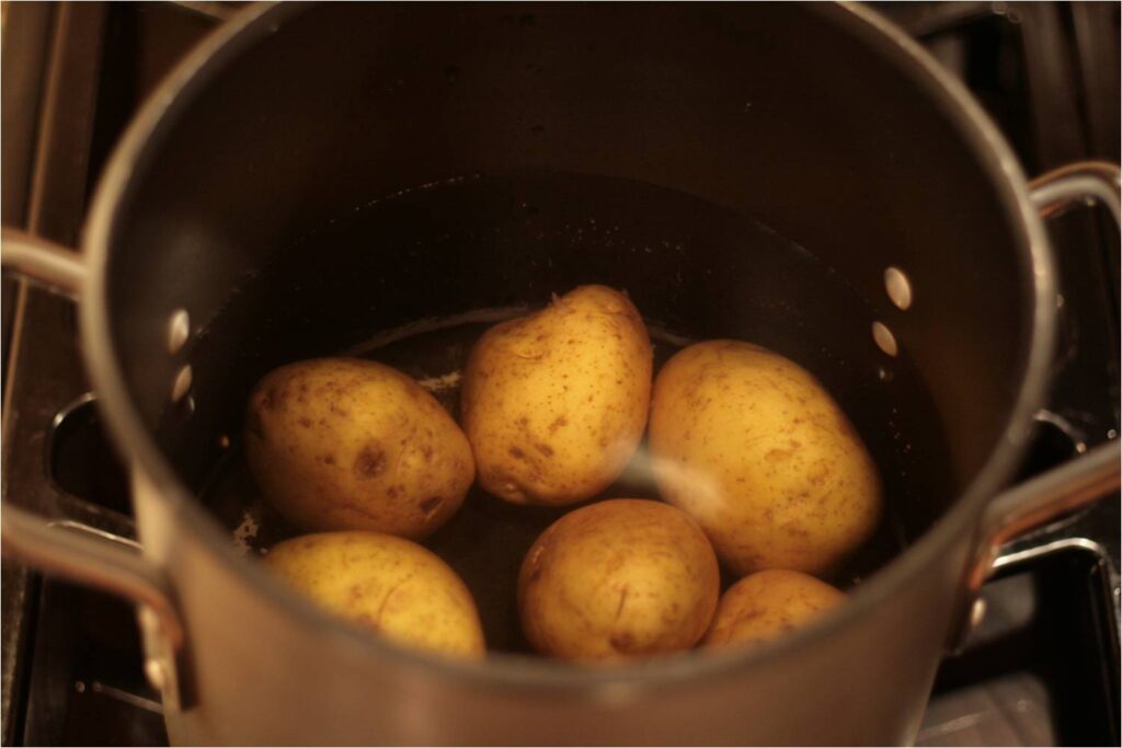 Put all potatoes in large pot and cover with water. Add one tablespoon of sea salt and bring to a full boil. Cook for approximately 12-15 minutes or until the potatoes are tender but not mushy when pierced with the tip of a knife. Drain the potatoes thoroughly.