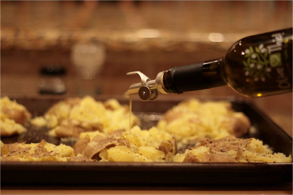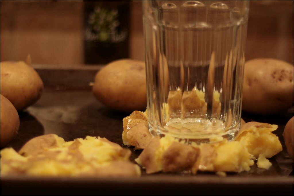 Rub a rimmed baking sheet liberally with garlic olive oil. Place the potatoes on the sheet pan and gently crush each potato using the bottom of a heavy glass.