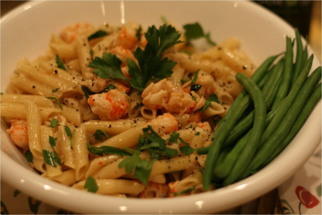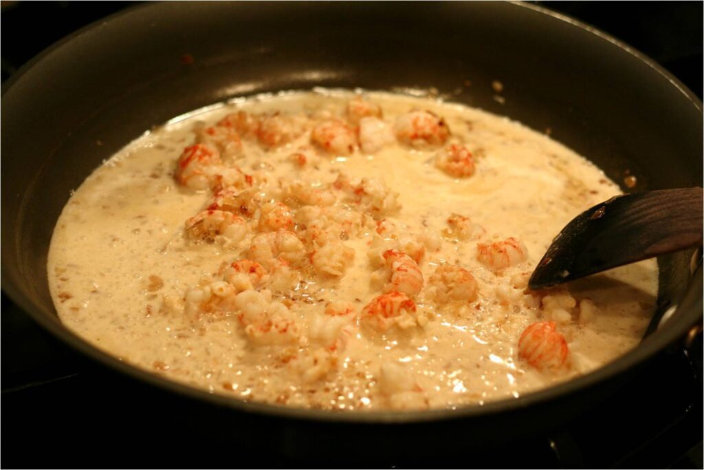 Loved this recipe – so simple! But I jazzed it up a bit and reduced the saturated fats. First, I sauteed some shallots and diced red pepper in a mix of olive oil and butter, and then added about a third of a cup of quartered crimini mushrooms, seasoning it all with dried tarragon and purple and compact basil, plus salt and pepper, and cooking until the mushrooms were browned and beginning to be tender. Beforehand I’d made a lobster broth reduction from the sauteed shells and some shallot pieces and Old Bay, plus a bay leaf. I added a third of a cup of that to the white wine and cooked vegetables. After cooking that down a bit, I dumped in about a 1/2 cup of fresh asparagus spears, cut into pieces. After a minute or two, I threw in the lobster pieces (which I’d marinated briefly in olive oil, a bit of white wine and some dried chipotle powder, cooked it all for another minute, then added the cream, heated it up again, thickened it with a tiny bit of cornstarch dissolved in water. I served it over the pasta and my husband ate every single bite. He’s a chef, so if he liked it, it must have been good.