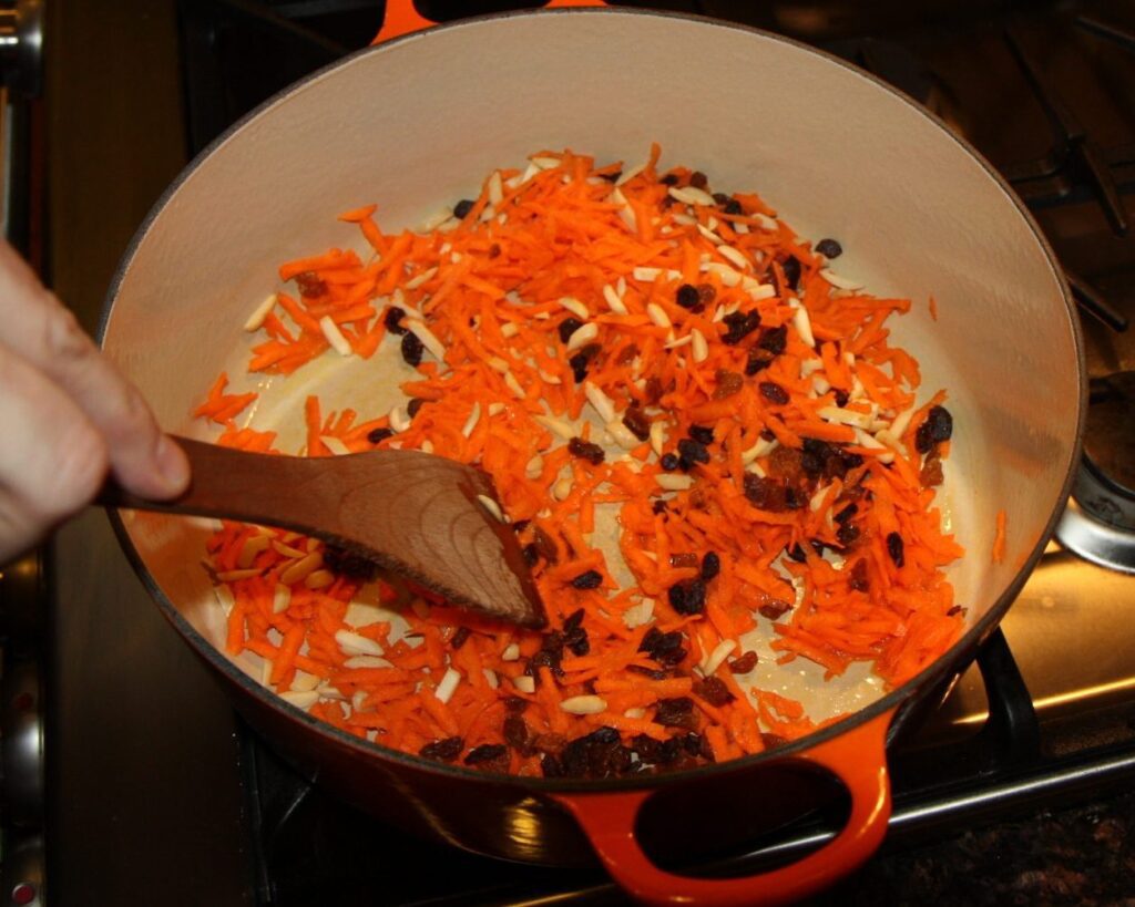 Heat olive oil in a Dutch oven over medium heat. Add carrots, raisins, and almonds and cook, stirring frequently, until carrots are wilted. About 4-5 minutes. Remove pot from heat and let cool for 5 minutes.